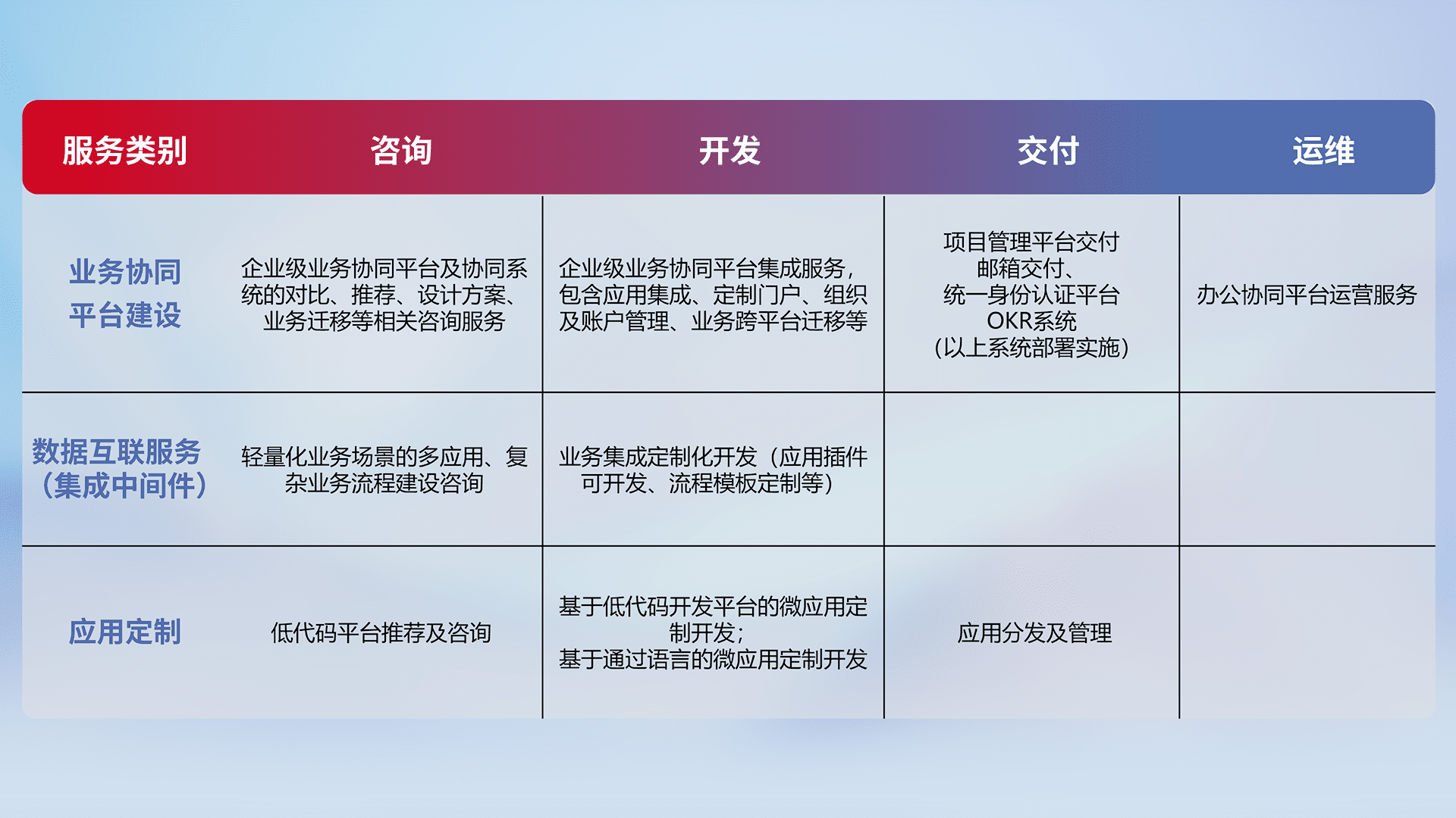 针对钉钉、、、、企微、、IDaas等平台级产品提供产品的规划、、、、方案、、、交付、、、、定制化开发等服务,,实现如统一协同办公、、、智能客户服务、、混合会议管理、、智能数据查询、、、、等业务场景,,,,实现数字化转型。。。