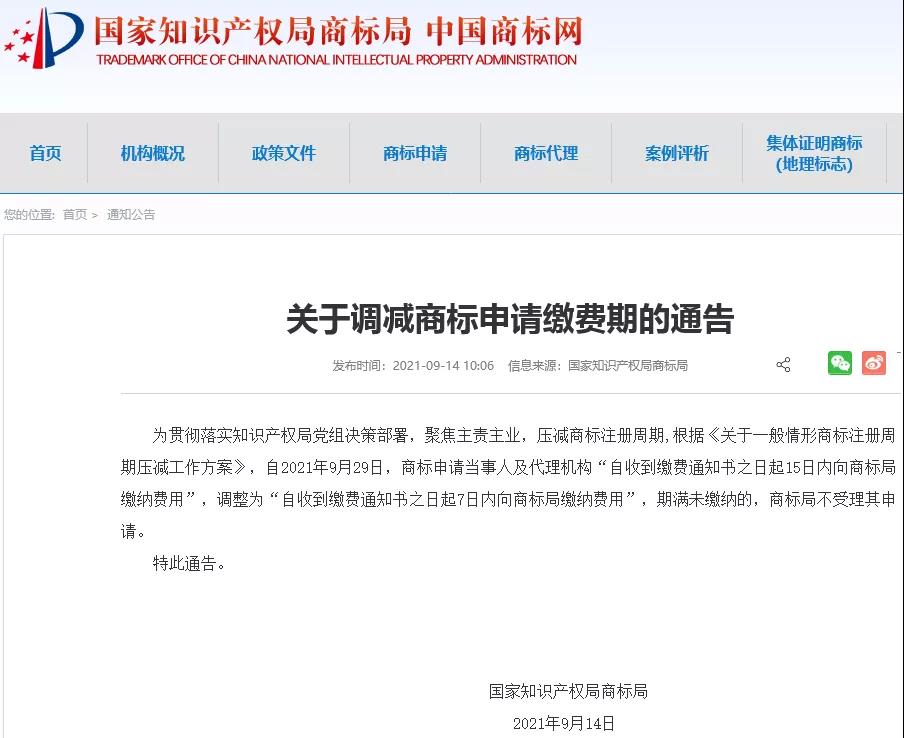 为贯彻落实知识产权局党组决策部署,,,,聚焦主责主业,,,,压减商标注册周期,根据《关于一般情形商标注册周期压减工作方案》,,,,自2021年9月29日,,,,商标申请当事人及代理机构“自收到缴费通知书之日起15日内向商标局缴纳费用”,,,调整为“自收到缴费通知书之日起7日内向商标局缴纳费用”,,期满未缴纳的,,,商标局不受理其申请。。