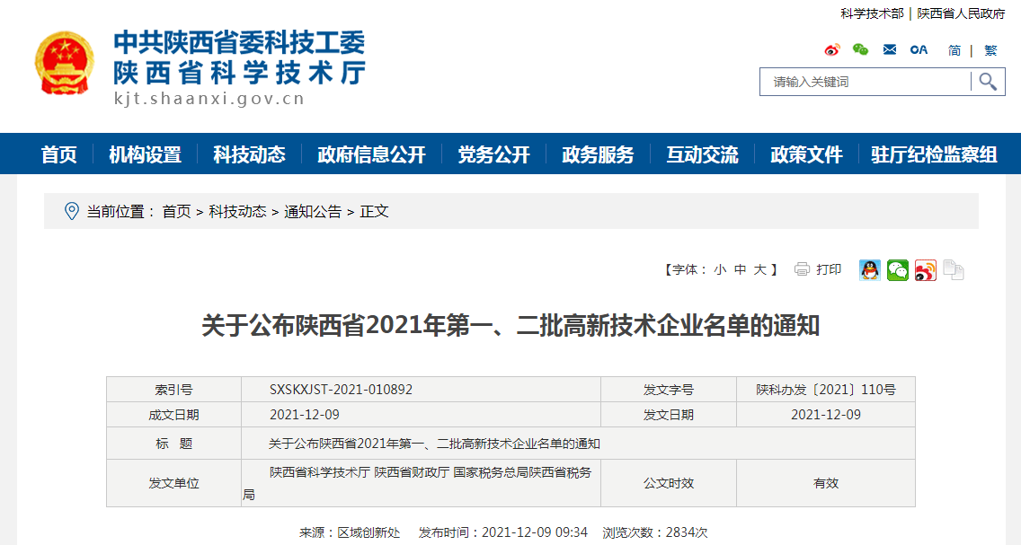 关于公布陕西省2021年第一、、二批高新技术企业名单的通知