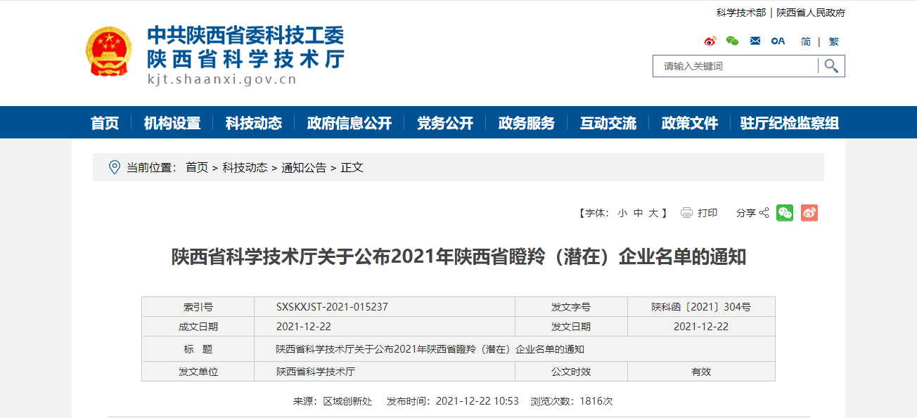 陕西省科学技术厅关于公布2021年陕西省瞪羚(潜在)企业名单的通知