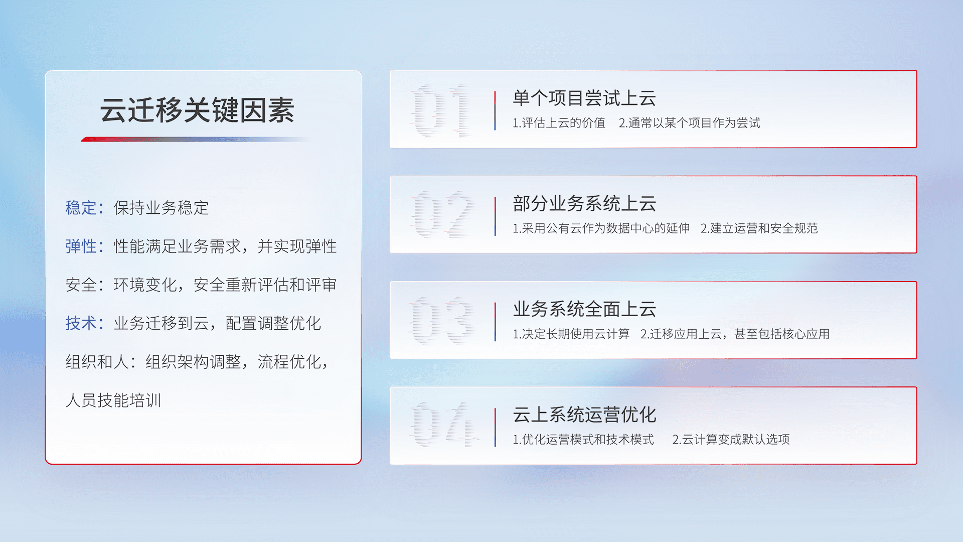 结合实际业务,,,,从规划设计、、、云平台选型、、、、云原生改造、、数据迁移、、集成交付,,,迁移全过程为客户识别最佳上云路径,,,做好风险识别管理,,,设计网络架构、、身份权限、、、安全审计合规、、操作审计、、、、日志审计、、监控告警策略、、多站点容灾设计等,,,对云上基础设施进行整体规划,,提升IT治理水平,,,,以满足弹性、、高可用、、、高性能的需求。。。。