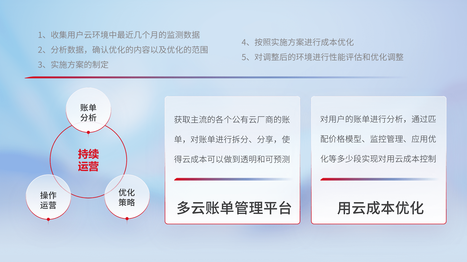 通过多云纳管,,以统一的资源数据模型把客户的云资源进行抽象和封装,,,进而实现对多云资源的统一操作,,保障云资源管理的可靠性、、、稳定性与可用性。。量身定制化运维内容,,,配置、、开发运维、、、、补丁管理、、备份、、监控、、、认证和访问管理、、、、审计和日常巡检等,,,保障在用云过程中的可靠度,,,稳定度以及高可用率。。。